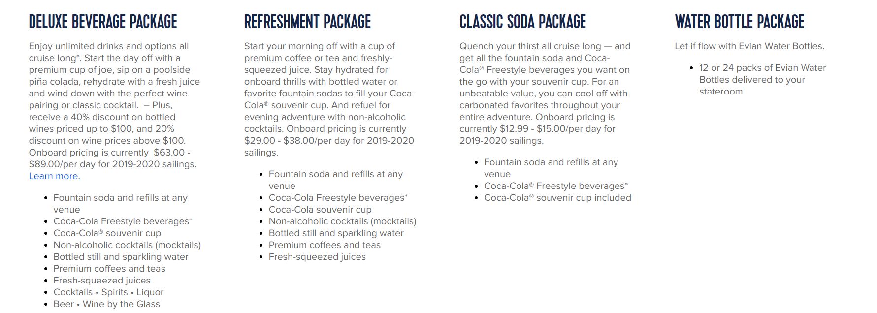 Soda Package: od 15 EUR na osobu a deň (vrátane daní a poplatkov) - zahŕňa bezlimitné množstvo nealkoholických nápojov vo všetkých zariadeniach na palube, plus suvenírový pohár Coca-Cola.