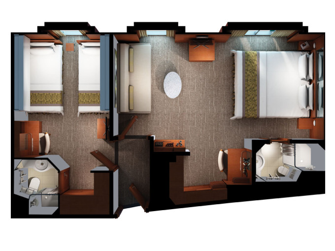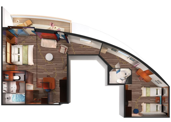 | SQ - Family Suite / obmedzený výhľad 33 m² . Panoramatické neotvárateľné okno s obmedzeným výhľadom. 7. paluba - stred. Výhody Suite. | 9 364 € 4 682 € za osobu |