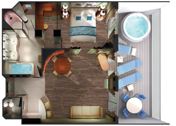 | S5 - Deluxe Owner's Suite 128 m² / balkón 45 m². 12. paluba - vpredu. Max 4 osoby. Výhody Suite. | 15 404 € 7 702 € za osobu |