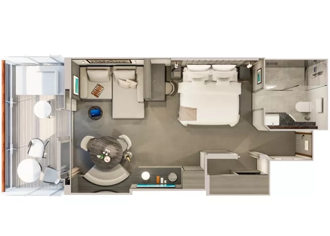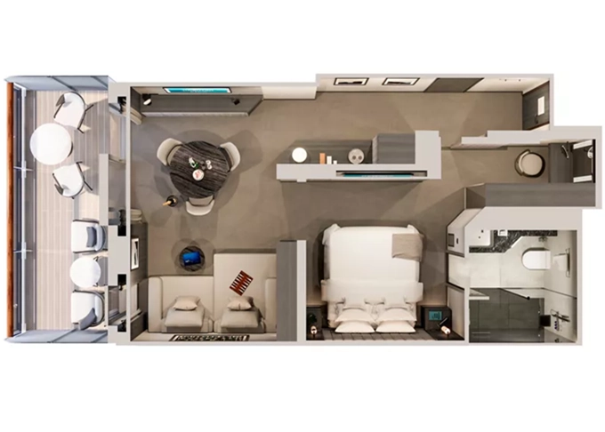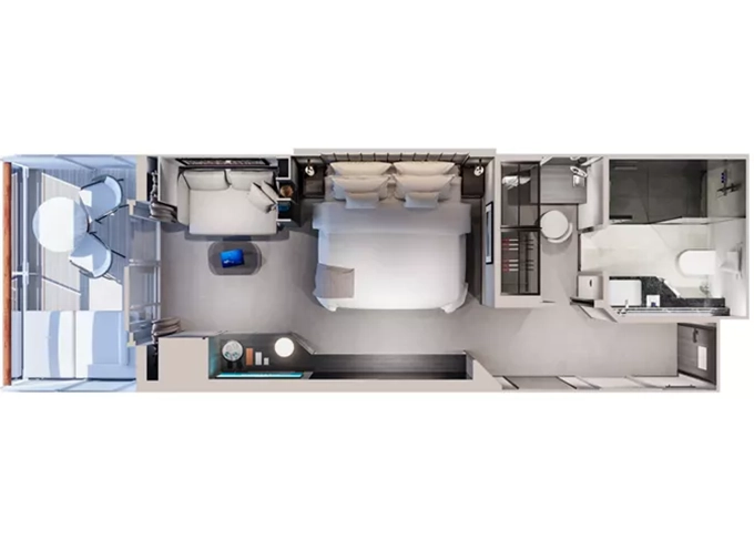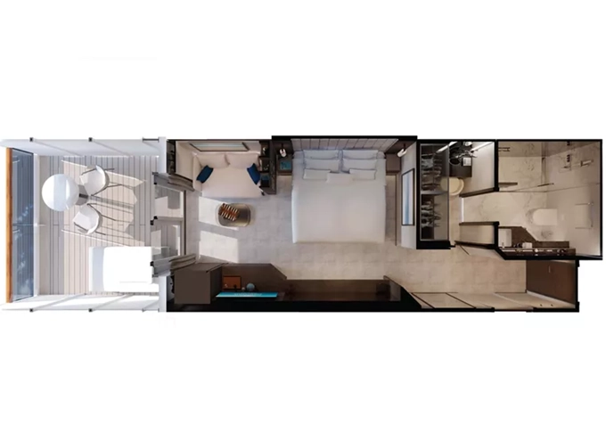 Ocean Residence - Cove Residence Suita + terasa so sedením a lehátkami 56 m². Spálňa s obývacou a jedálenskou časťou, šatník. Koktailová súprava, minibar, kávovar, vodná kanvica, ďalekohľad, sejf, kúpeľňa so sprchou. Závesy, svetlo, klimatizácia ovládané smart technológiou. Taška Technogym Case Kit. Fľaša šampanského na privítanie. Maximálna kapacita 3 osoby. 42 420 € 10 605 € za osobu