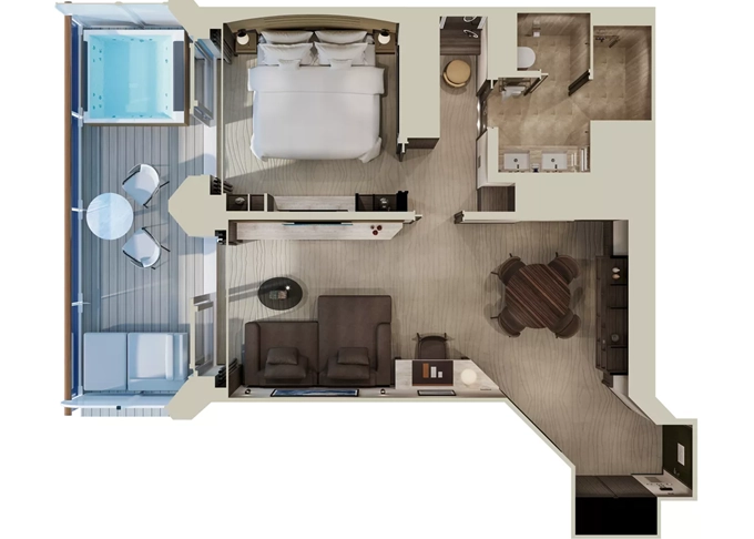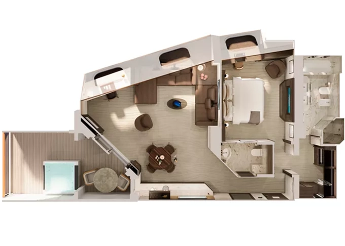 Ocean Residence - Cove Residence s vírivkou Suita + terasa s vírivkou a lehátkami 56 m². Spálňa s obývacou a jedálenskou časťou, šatník. Koktailová súprava, minibar, kávovar, vodná kanvica, ďalekohľad, sejf, kúpeľňa so sprchou. Závesy, svetlo, klimatizácia ovládané smart technológiou. Taška Technogym Case Kit. Fľaša šampanského na privítanie. Maximálna kapacita 3 osoby. 31 911 € 10 637 € za osobu