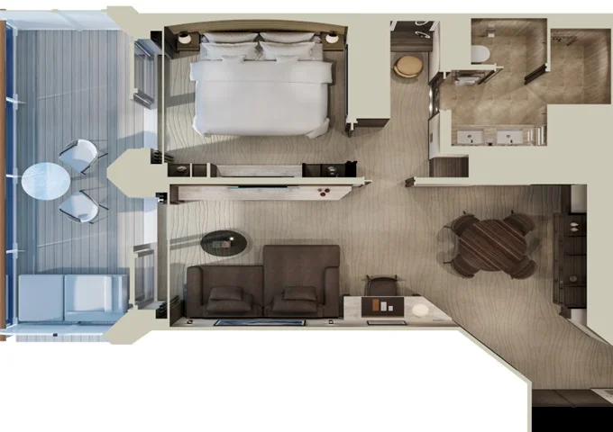Ocean Suites - Ocean Grand Terrace Suite Suita 28 m² + kúpeľňa 4 m² + terasa so sedením a pohovkou 11 m². 6/7. paluba. Spálňa s obývacou časťou, šatník. Minibar, kávovar, vodná kanvica, ďalekohľad, sejf, kúpeľňa so sprchou. Fľaša šampanského na privítanie. 6, 7. paluba. Maximálna kapacita 2 dospelé osoby + 1 dieťa do nedovŕšených 18 rokov. 9 735 € 9 735 € za osobu