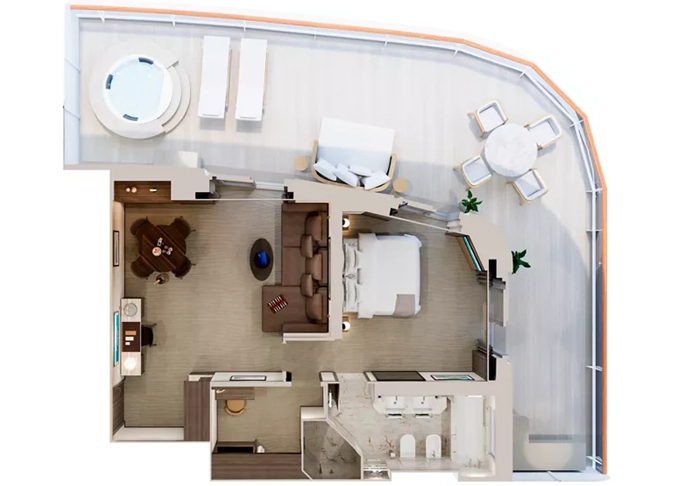Retreat Residence Suita 63 m² + Terasa s vírivkou a sedením 14 m² / 7. paluba: 18 m². Spálňa s obývacou a jedálenskou časťou, šatník. Koktailová súprava, minibar, kávovar, vodná kanvica, ďalekohľad, sejf, mramorová kúpeľňa s vaňou a sprchou, extra wc. Taška Technogym Case Kit. Fľaša šampanského na privítanie. Služby osobného majordóma. Maximálna kapacita 3 dospelí alebo 2 dospelí + 2 deti pod 18 rokov. 28 725 € 28 725 € za osobu